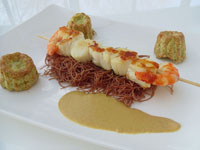 Brochette de lotte et Saint Jacques à la fondue de poireaux. .